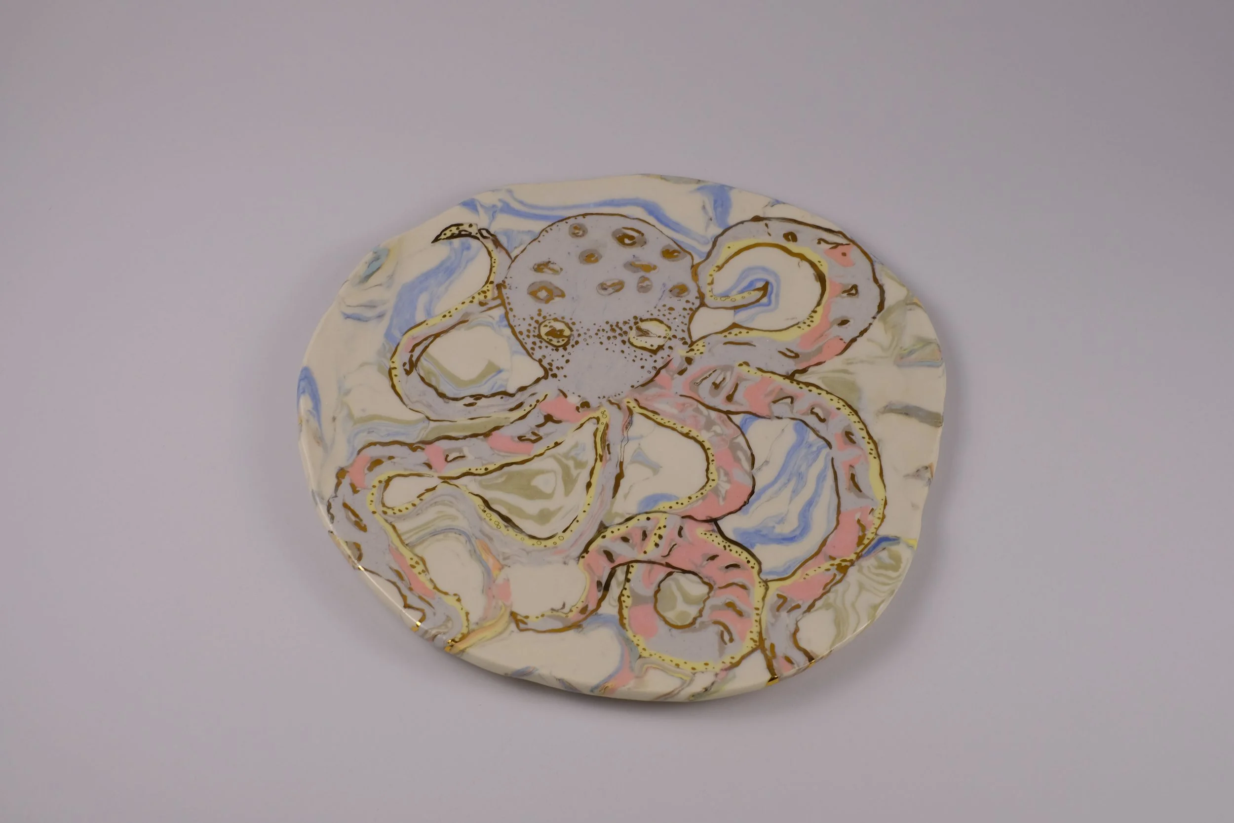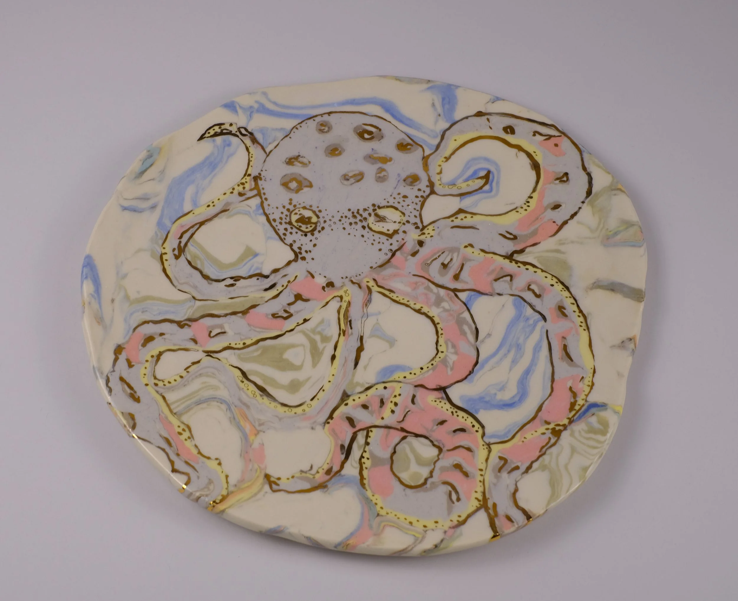 Nerikomi hand- patterned stoneware clay, potter’s stain, glaze, gold luster detail.