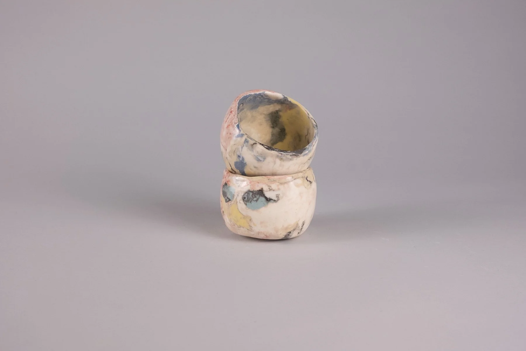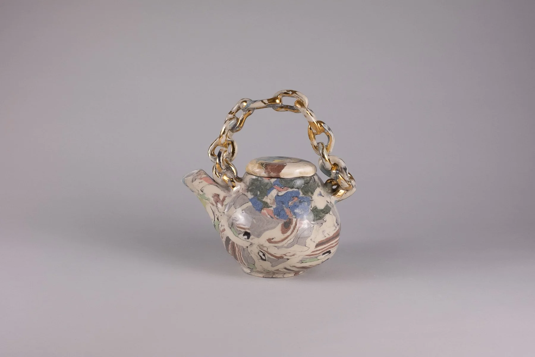 Porcelain/ mixed stoneware clay bodies, potter’s stain, glaze, gold luster.