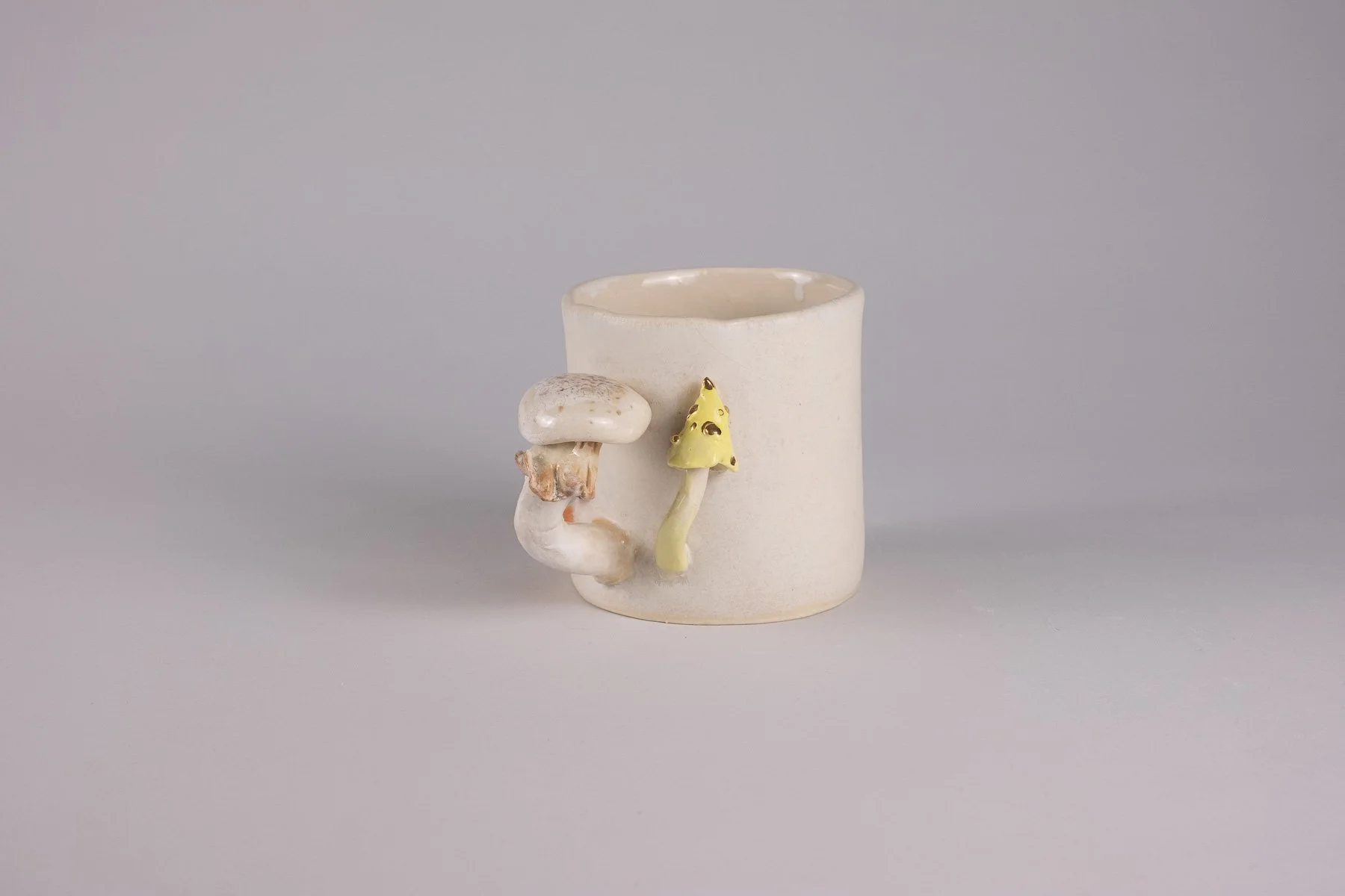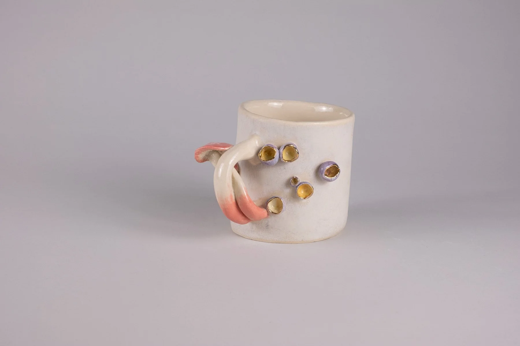 Hand-built ceramic stoneware mugs, underglaze, glaze, metallic gold, mother of pearl luster.