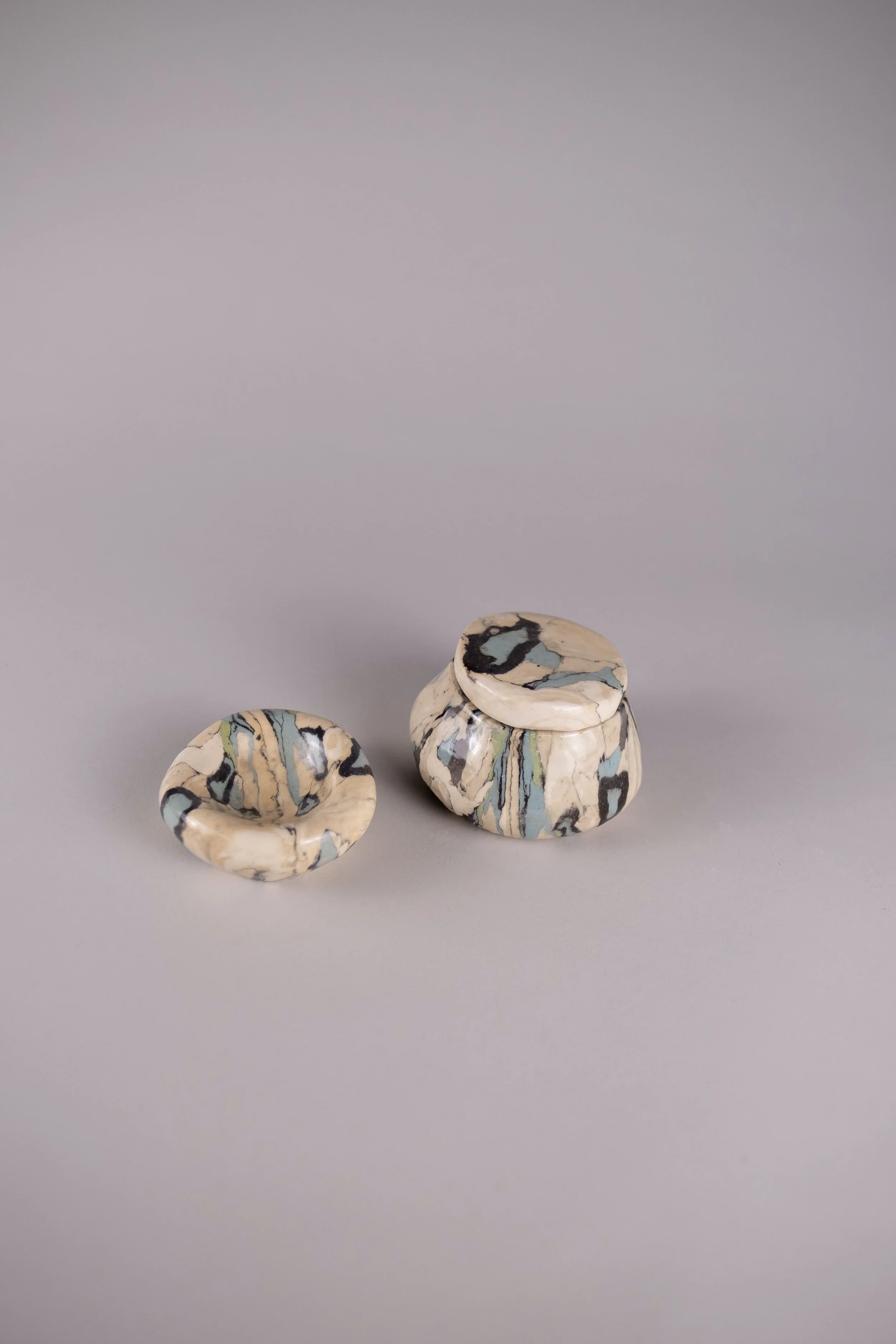 Set of 2 Nerikomi, slab-built forms - lidded pot and dish. Porcelain, mixed stoneware clay bodies, potter’s stain, glaze.