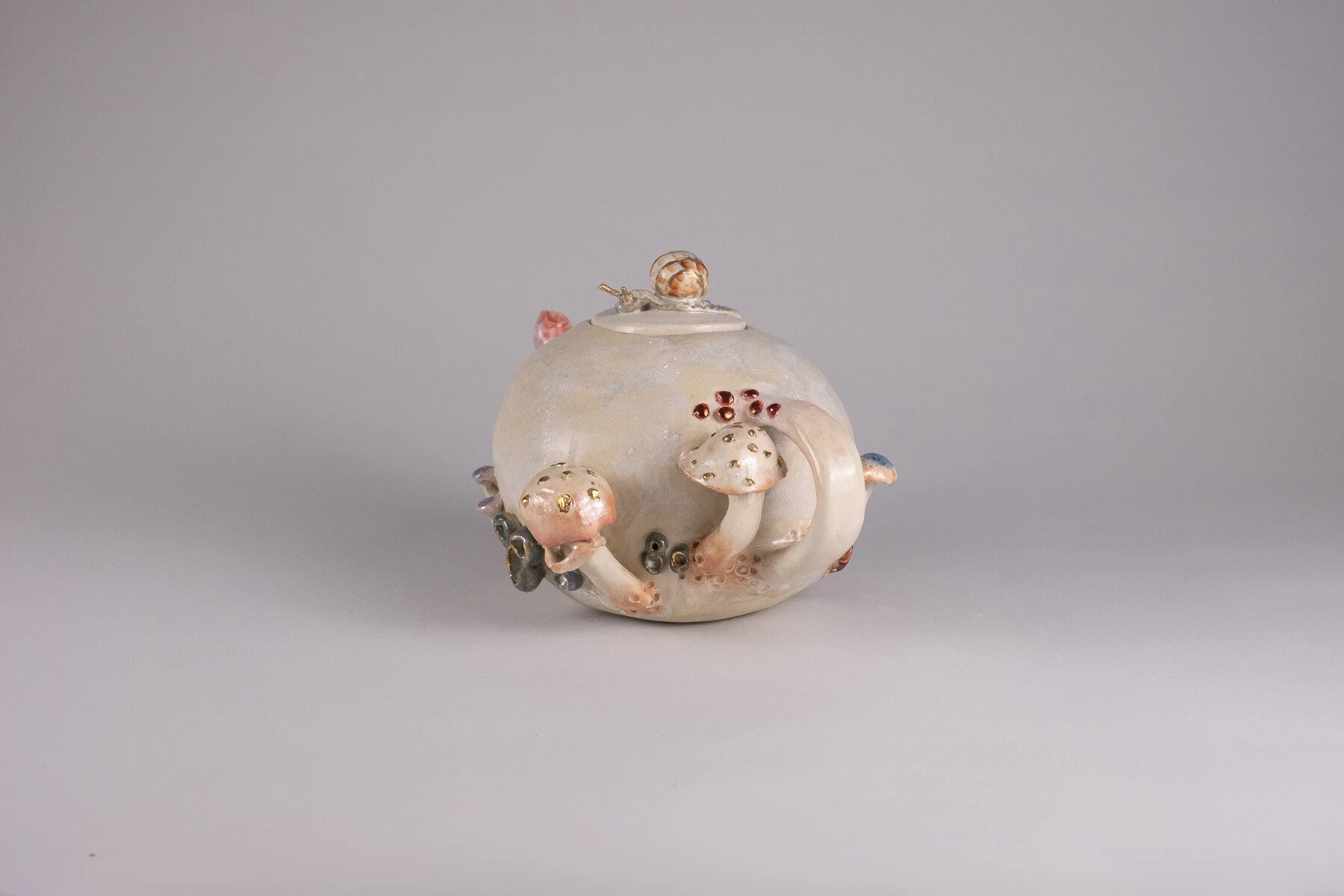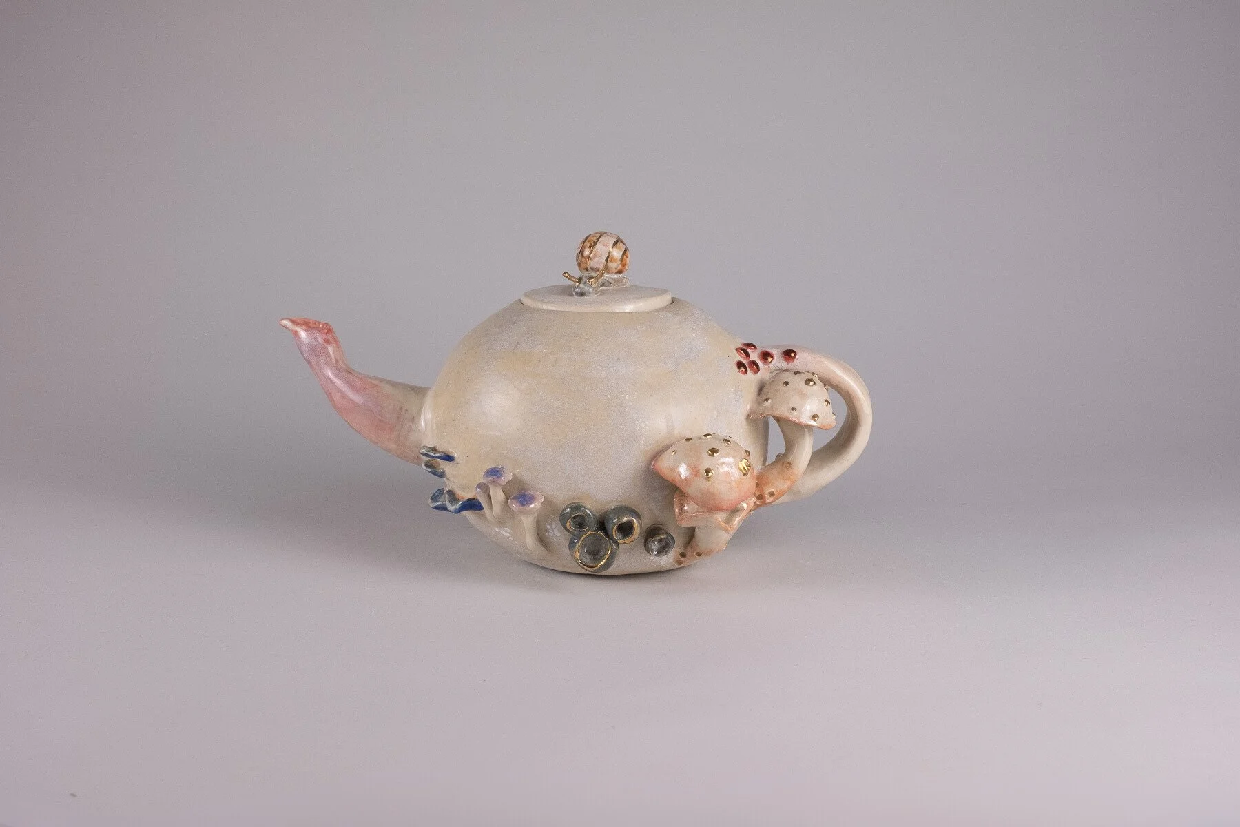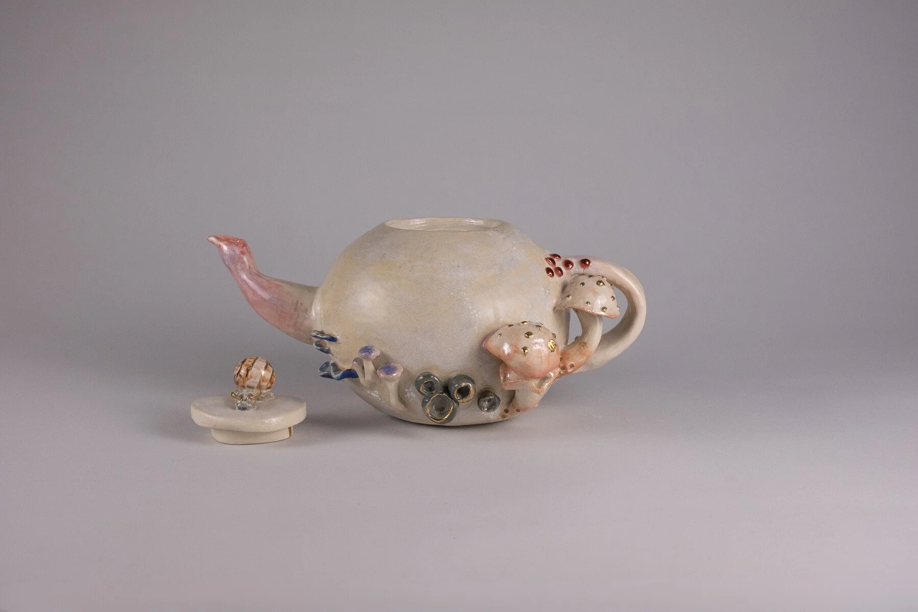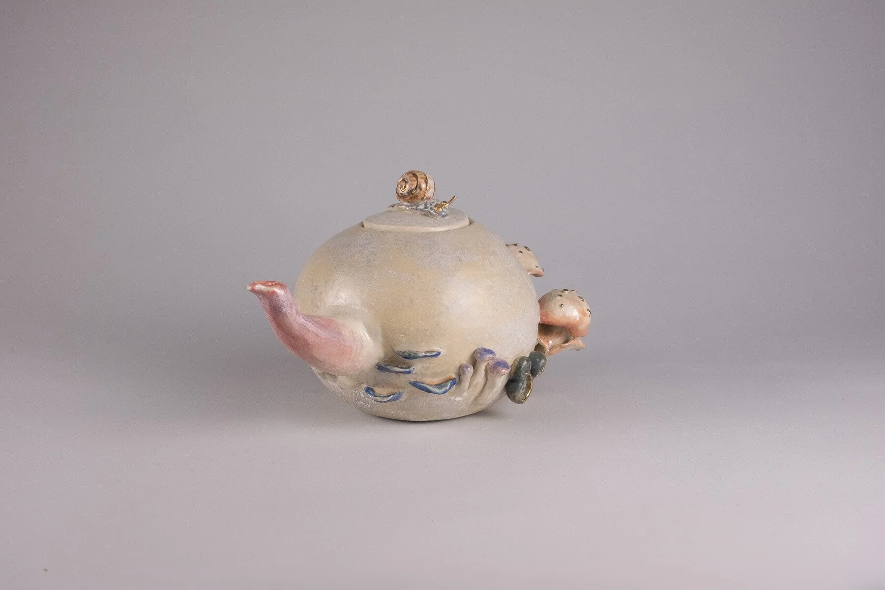 Slab-built and hand sculpted teapot, stoneware clay body, underglaze, glaze, gold luster. (snail tentacles- epoxy, copper, gold ink)