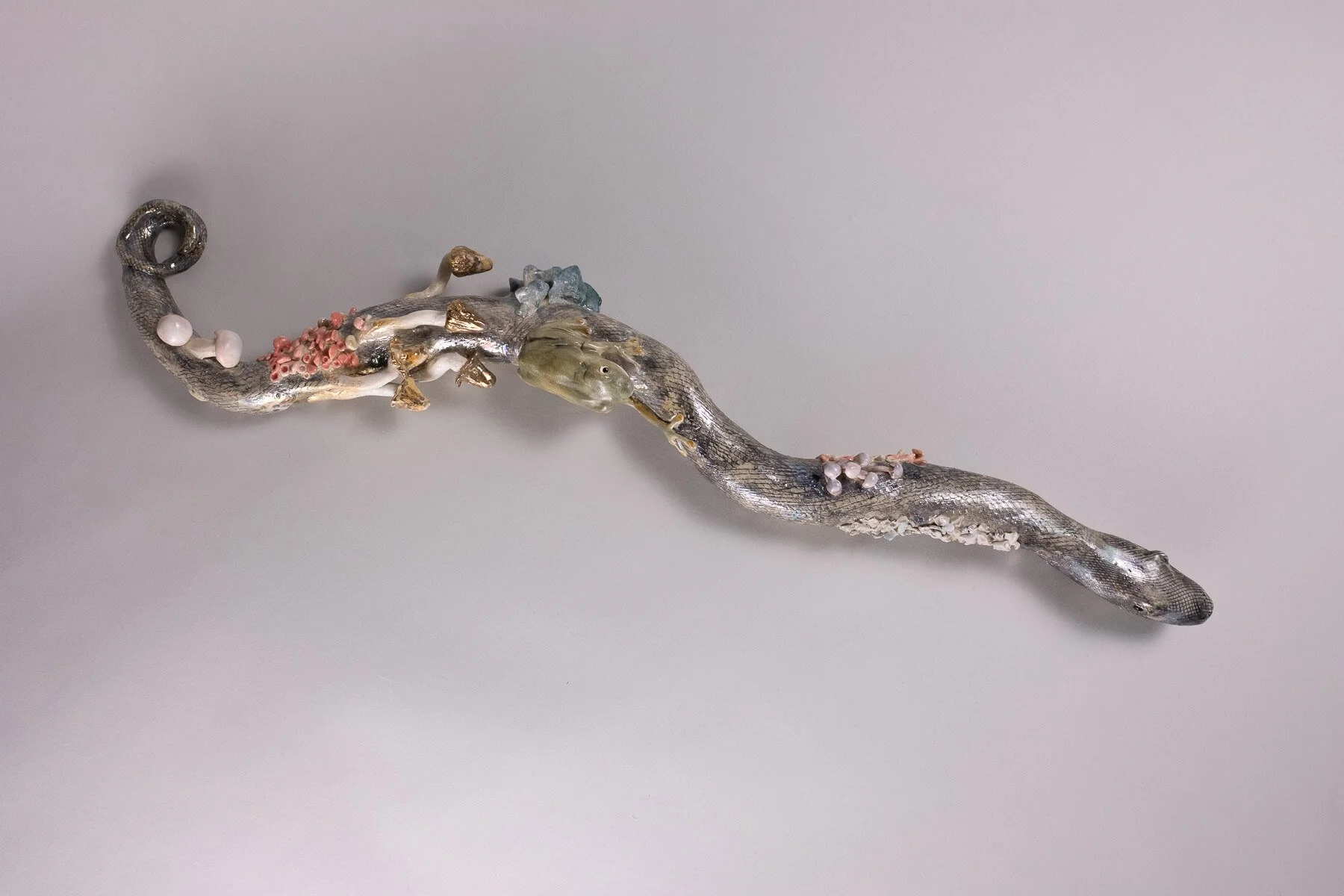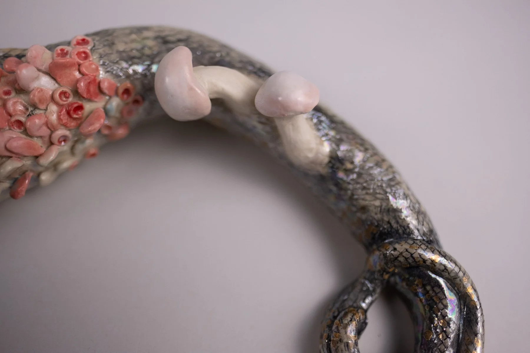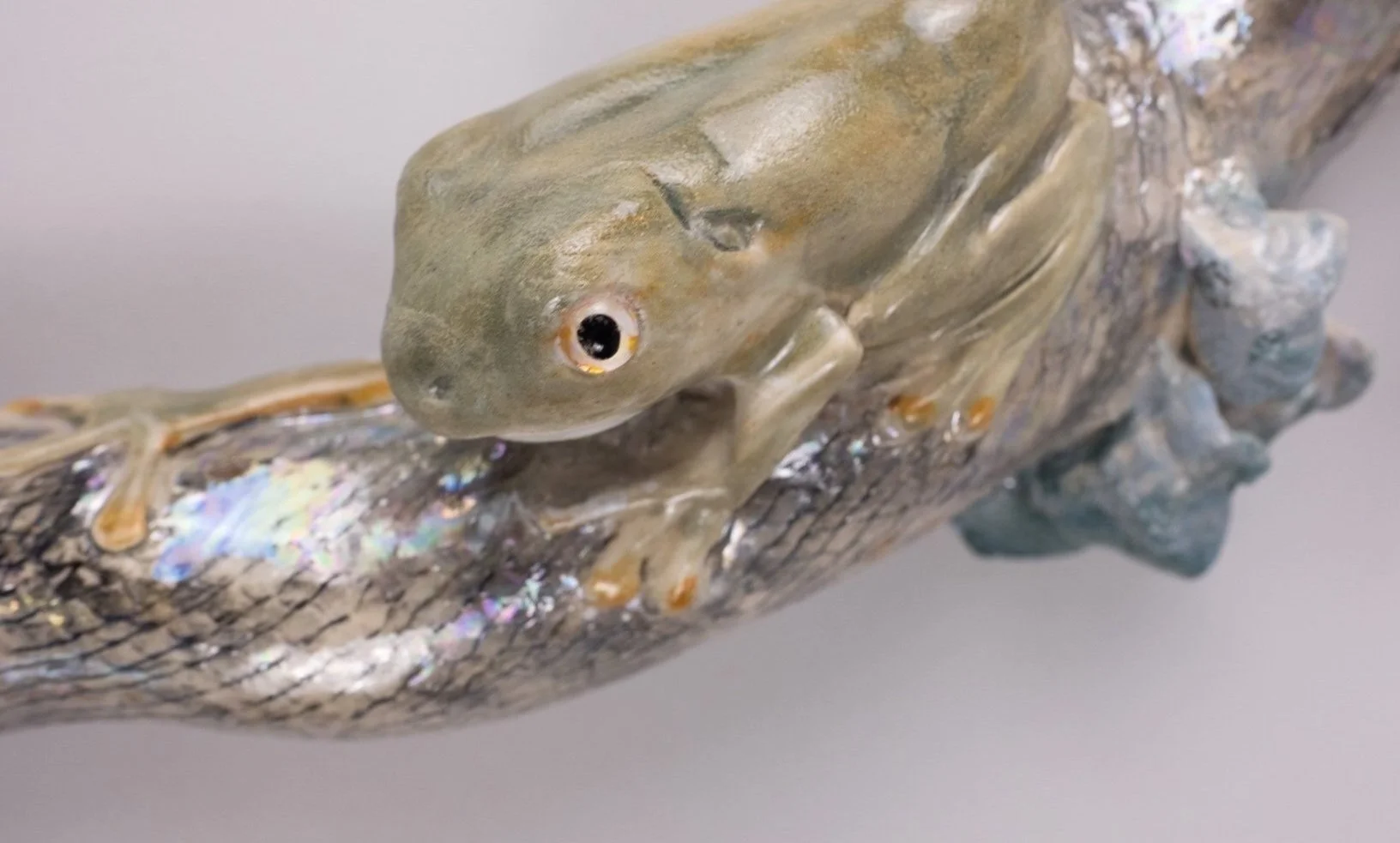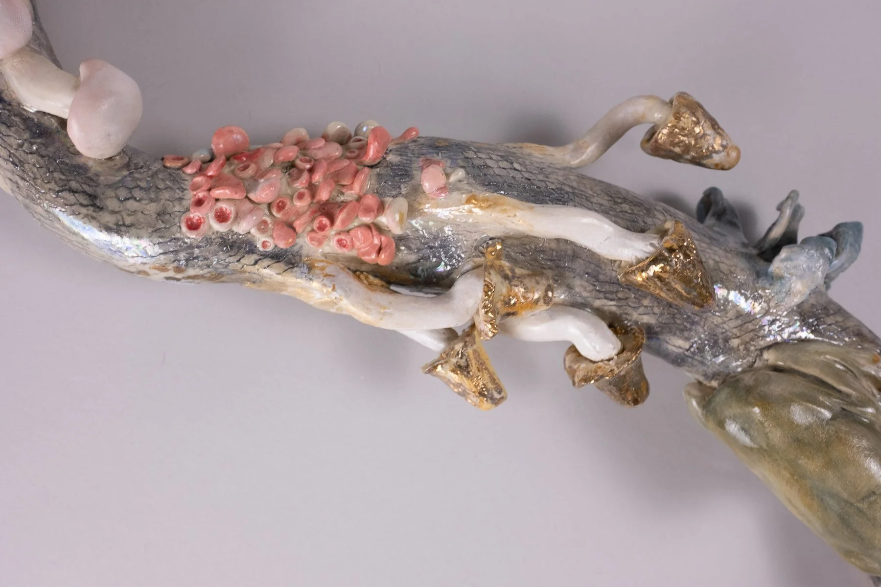 Wall hung ceramic hand-built sculpture. Stoneware clay, underglaze, glaze, gold luster, mother of pearl luster, hand-painted glass eyes.